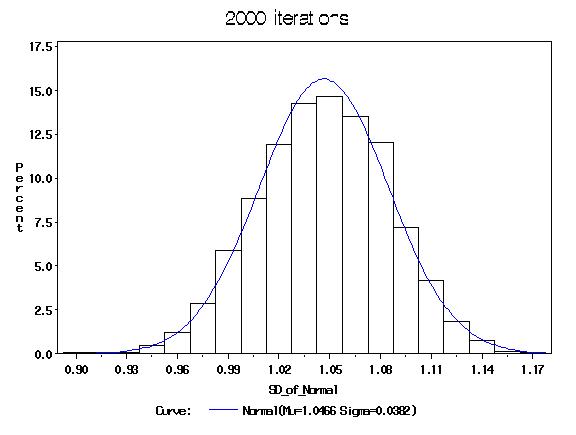 B = 2000 samples with replacement of size n=300 were drawn from the original 300 data samples. The mean and standard deviation were then computed for each bi. The following histograms of the mean and the SD resulted by placing a probability of 1/B for each bi statistic: