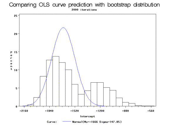 All of the regular OLS estimates were significant at the 98% level. Notice the large discrepancy between the confidence intervals of the parameters of the Intercept and S. The following chart shows the OLS prediction of the intercept, ß0~N[ß0 = -1666.44, Var = 21859.62] against the histogram of the bootstrap estimate of ß0: