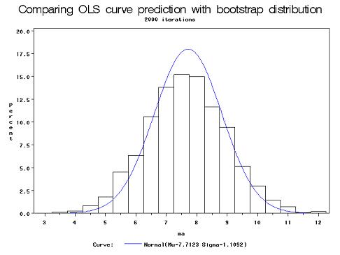 The estimate of the bootstrap parameter of ma, ß1, was the only significant fit according to the Chi-square test. The following shows the bootstrap histogram against the regular OLS regression parameter ß1~N[ß1 = 7.71, Var = 1.21]:
