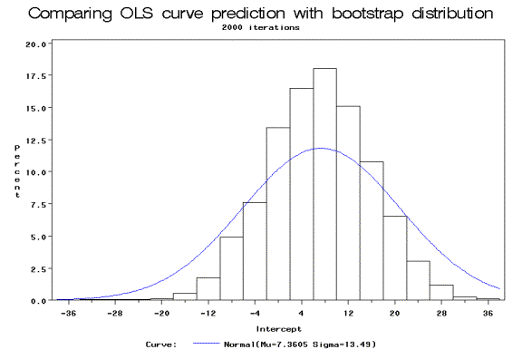 Both of the bootstrap estimates of the parameter distributions were normally distributed. The confidence interval for the bootstrap estimate of ß0 was actually tighter, or more efficient, than that of the regular OLS regression:
